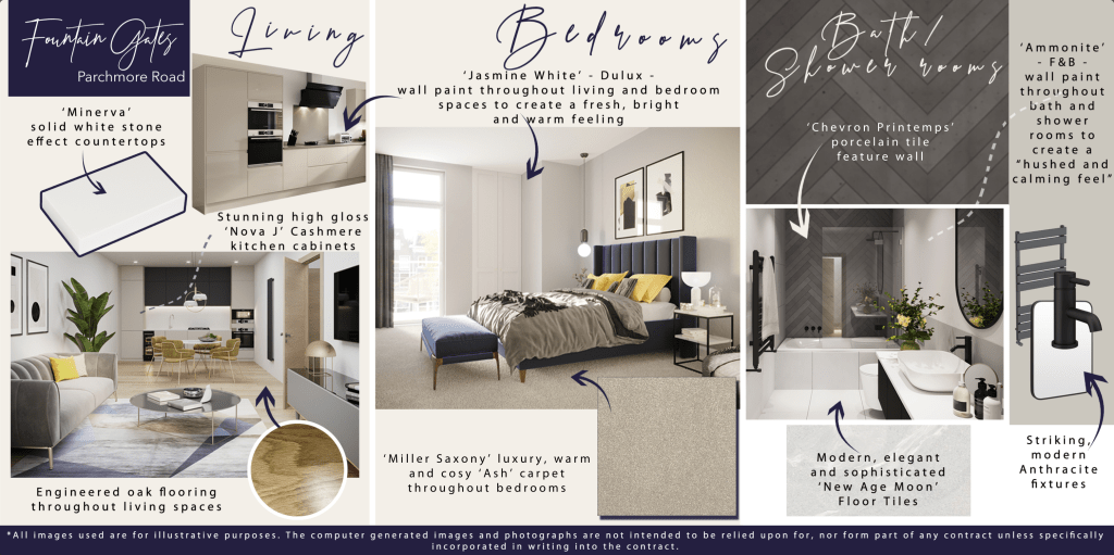 Vision board created for the Fountain Gates development in Croydon. Images were sourced from the development’s brochure and combined with examples of materials so that prospective buyers could visualise the intended finish of the properties and buy off-plan.